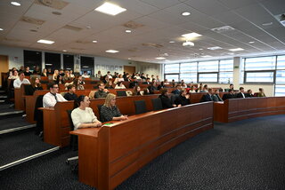 Najsilnejšou časťou programu bola otvorená diskusia, v ktorej študenti kládli svoje otázky priamo tým najpovolanejším – predsedovi TSK, Ing. Jaroslavovi Baškovi a vedúcej odboru školstva a kultúry TSK, Ing. Martine Knappovej.